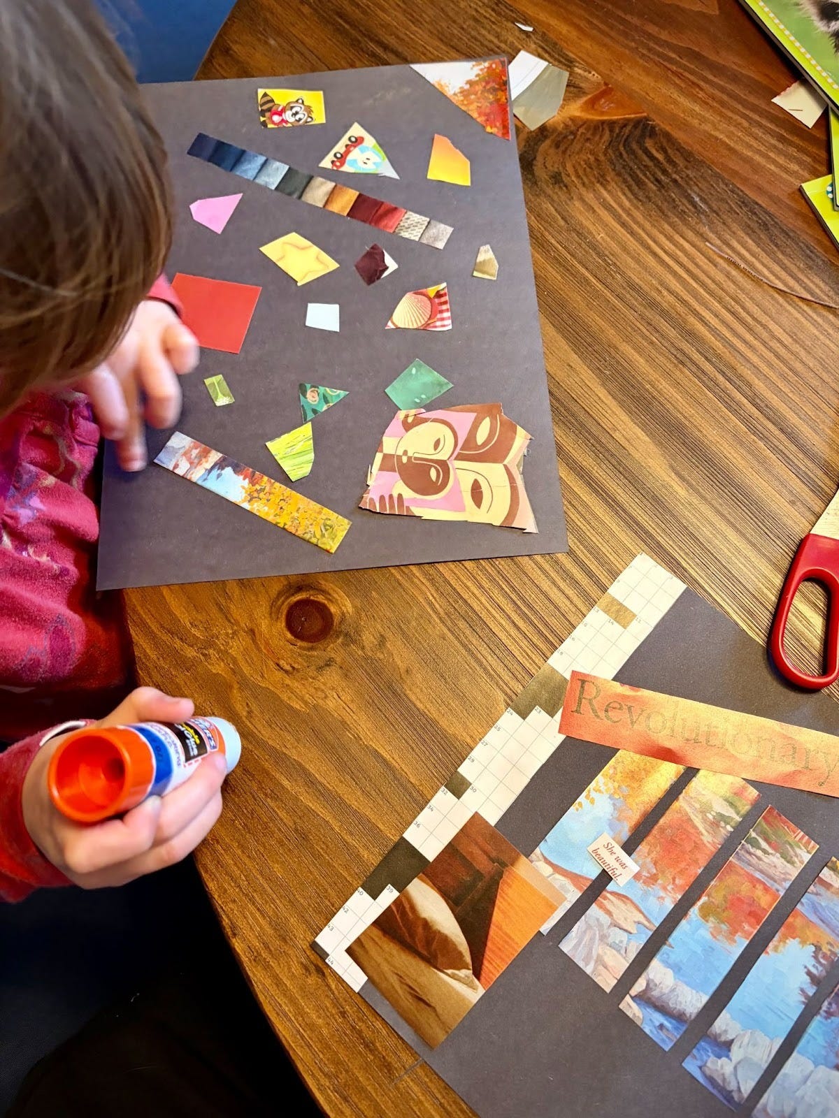 We also had two pairs of scissors; two pieces of construction paper — black, a clever suggestion of hers (“it will make the stuff we cut stand out more!”) — and one sad glue stick: nearly used up, sticky with old residue, passed back and forth like a precious resource.